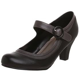 Fashion-right, office to evening style Two-tone synthetic upper Cushioned footbed 1-1/2" stacked-look heel Mary Jane strap with buckle closure