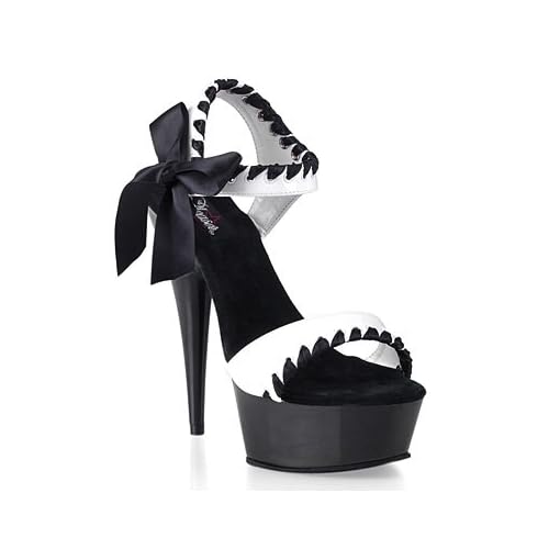 Ooh la la! This ultra-sexy style from Pleaser will turn men to mush! The Delight sandal features a patent upper with a ribbon laced through its saucy grommets that finishes in a sweet little bow. Its provocatively high platform and heel will put you head and shoulders above the rest, while its padded, sueded footbed helps keep you comfy all the while.